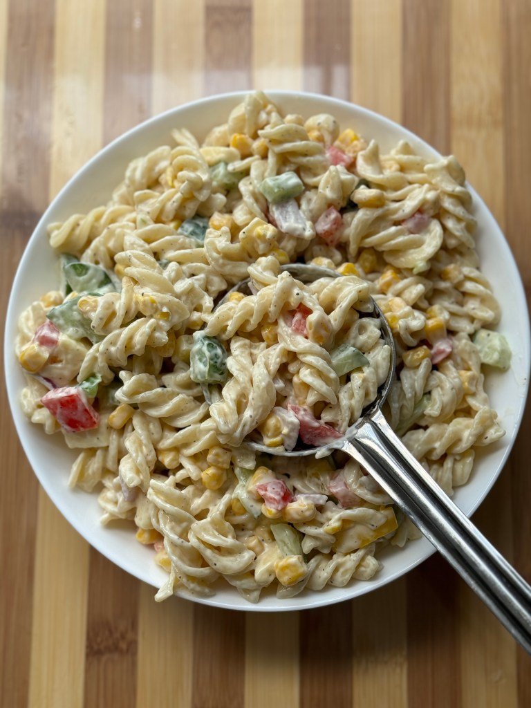 4. When your pasta is dry, place it into a bowl then add all of your ingredients and mix together.