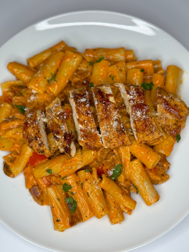 10. Serve by adding your pasta to a plate, slicing the grilled chicken you made earlier and adding on top, you can add more parmesan cheese on top.